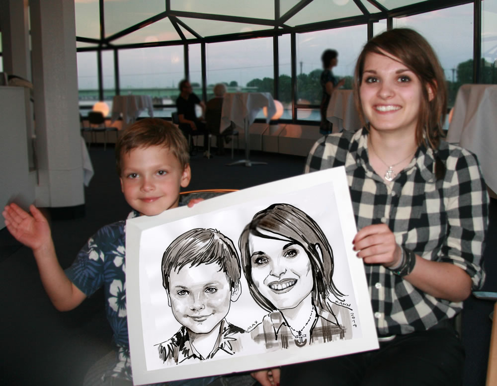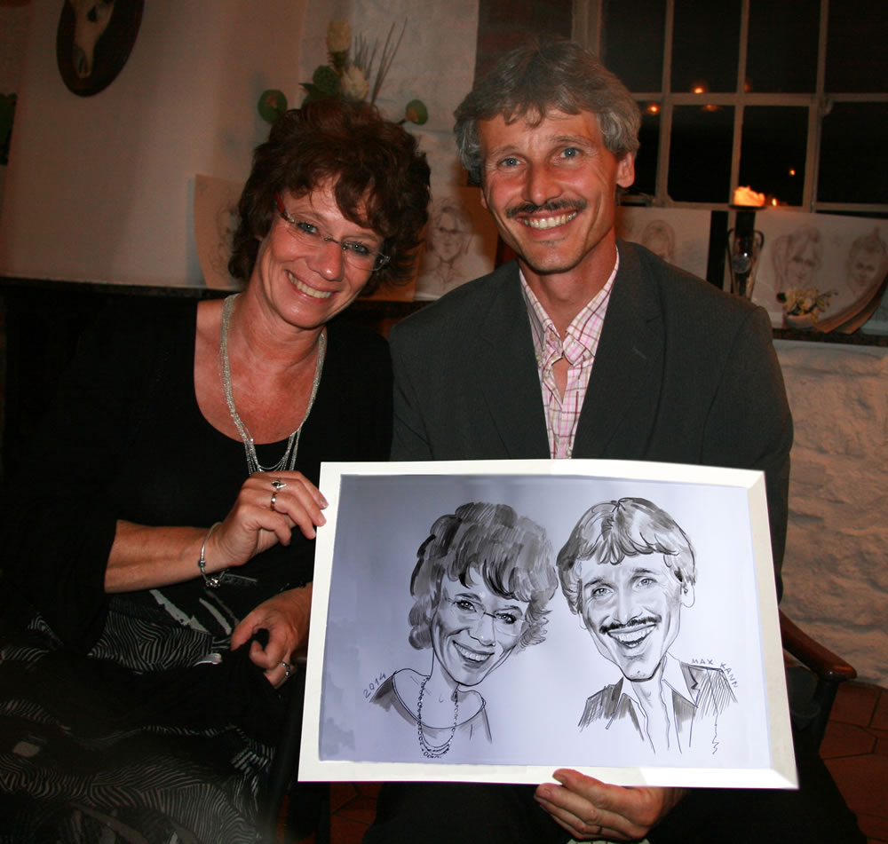 „Karikieren“ heißt „übertreiben“. Der eine hat eine prominente Nase, der andere einen wilden Haarschopf; die eine zeigt alle Zähne, die andere sieht selbst beim Lächeln etwas nachdenklich aus. Der Karikaturist Max sieht nicht nur die groben Gesichtszüge, sondern alle Feinheiten, nicht nur das Äußere, sondern auch den Charakter. Eine Karikatur kann den Menschen auslachen, muss sie aber nicht. Freundliche Ironie funktioniert oft besser als Satire.